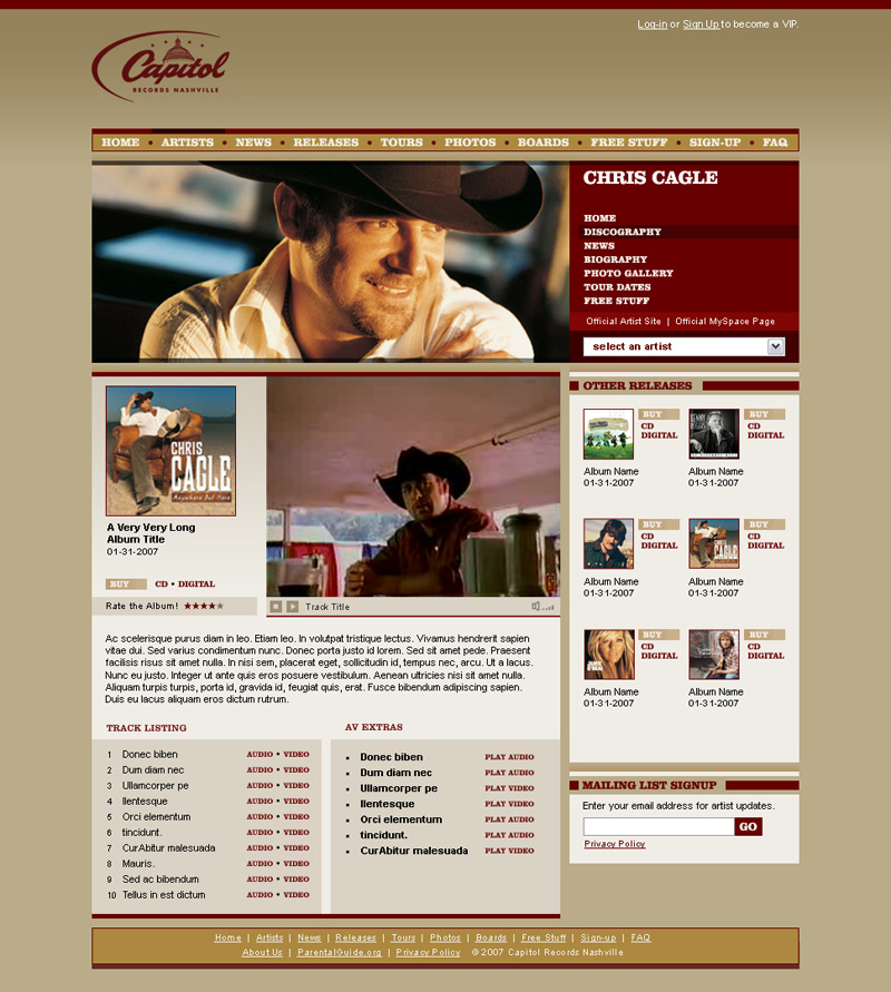Client: Capitol Records Type: Record Label Web Site [working w/ Fearless Concepts] Role: Design and production: XHTML, CSS, Flash, ASPX