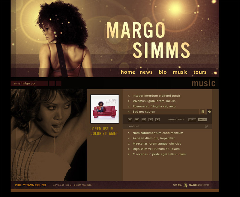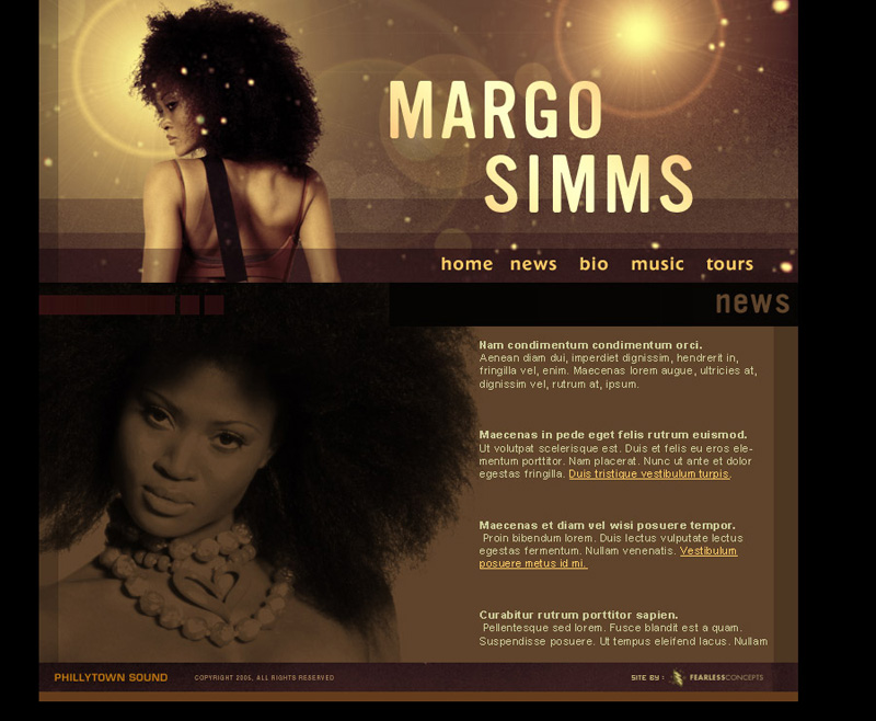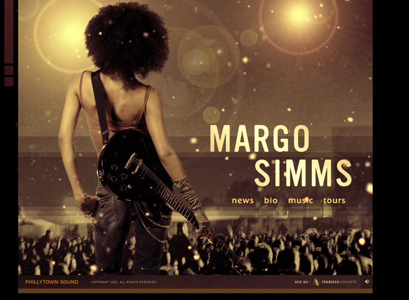 Client: Phillytown Records Type: Singer web site [working w/ Fearless Concepts] Role: Design and production: Flash, HTML, CSS, XML, JS, PHP, CMS integration