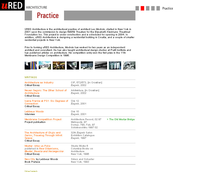 The online portfolio of Leo Modrcin's Ured Architecture, a superb NYC architecture firm which produced numerous award winning buildings such as the 59E59 Theatre in Midtown Manhattan.